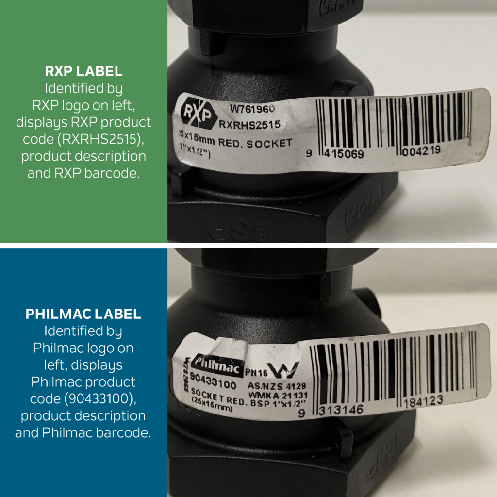 The BSP threaded fittings are manufactured by Philmac and the product labels are transitioning from RXP branded labels to Philmac branded labels. This means the product codes and barcodes on the labels will change. The below example highlights the differences.