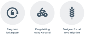 The Karousel will allow the pod line to be moved around 90° and two of these units through 180° . This help when shifting the line down between the row of crops.